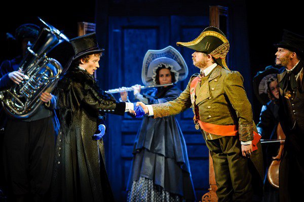 Основным же мотивом декорационного оформления стали двери, которых множество. Они замечательным образом создают пространство странного лабиринта, в котором заплутали гоголевские персонажи. Здесь смешно материализуются мечты и сны, бродят огромные крысы, которые, как известно, «понюхали и пошли прочь», но к финалу вернулись в большем количестве. Хлестакову – Александру Кудину в пьяном бреду является Пушкин, «на дружеской ноге». В пластических мотивах русская плясовая сменяется жеманным менуэтом, герои то сбиваются в общий хоровод, то протанцовывают свои сольные партии. И делают это слаженно и весьма профессионально, несмотря на объемность одеяний, которые отнюдь не затрудняют пластику. Конечно же, стоит отметить замечательные работы Кудина – Хлестакова, Олега Филипчика – Городничего, Светланы Дикаанидас в роли томной и страстной одновременно Анны Андреевны и хрупкой до воздушности Кристины Асмус – Марьи Антоновны. Впрочем, убрать кого-то из этого ряда невозможно, этот спектакль обязательно стоит увидеть собственными глазами и, быть может, наконец-то понять, что классика – далеко не скучное дело.